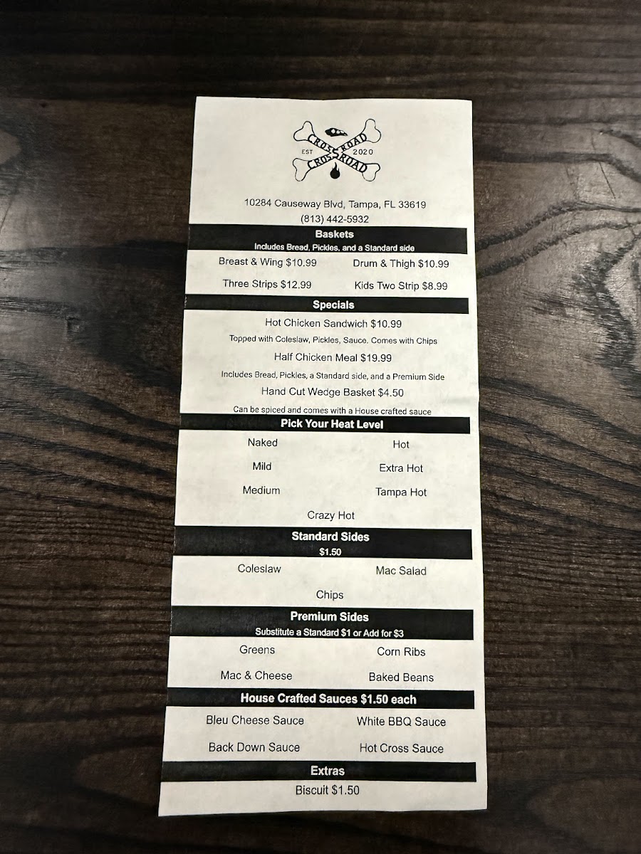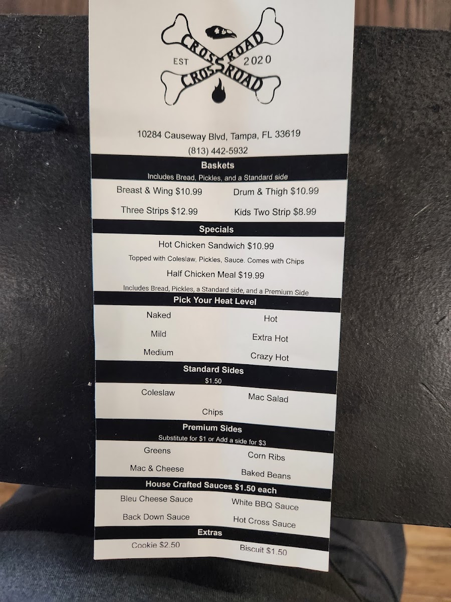Welcome to Crossroad Hot Chicken, your go-to destination for an exhilarating culinary experience in Tampa! Located at 10284 Causeway Blvd, this haven for spicy food lovers offers a menu packed with mouthwatering options. The standout dish is the Hot Chicken Sandwich, layered with crunchy coleslaw, tangy pickles, and your choice of house-crafted sauces, all for just $12.65. For those seeking the perfect accompaniment, try the HandCut Wedge Basket, customizable from mild to “crazy hot” for only $5.20. The sauces at Crossroad are a true indulgence, featuring their iconic Hot Cross Sauce and herby Bluе Cheese Sauce, each priced at $1.75. Customer reviews rave about the tender, flavorful chicken and the unforgettable corn ribs—definitely a highlight! With friendly service and a warm atmosphere, Crossroad Hot Chicken promises a delightful, spicy adventure.